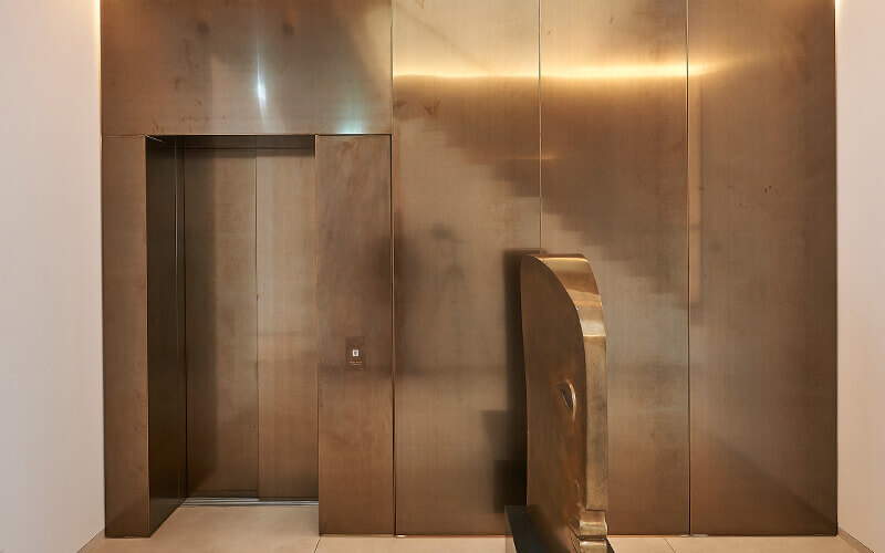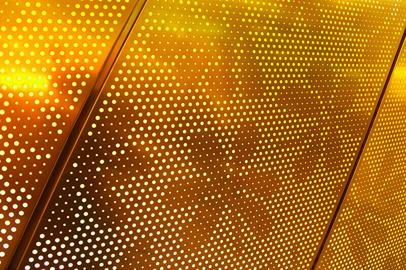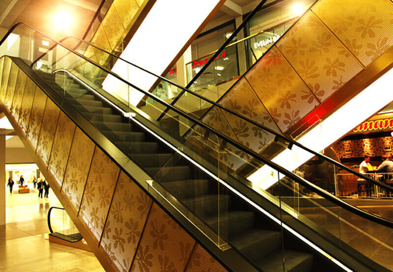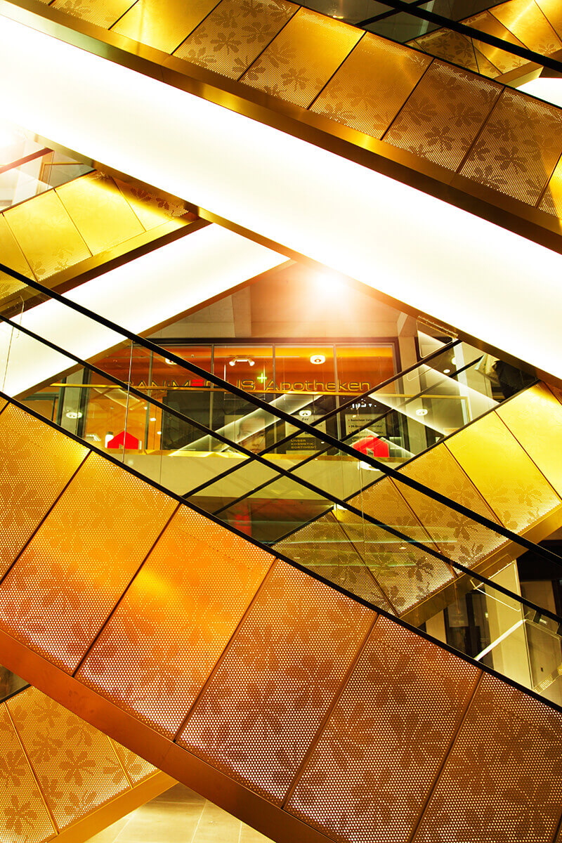 Rolltreppenverkleidung aus Messing mit floralem Lochmuster