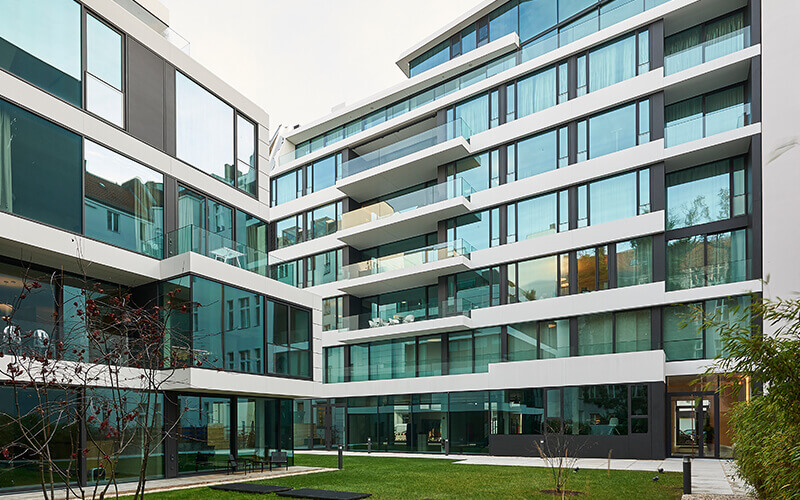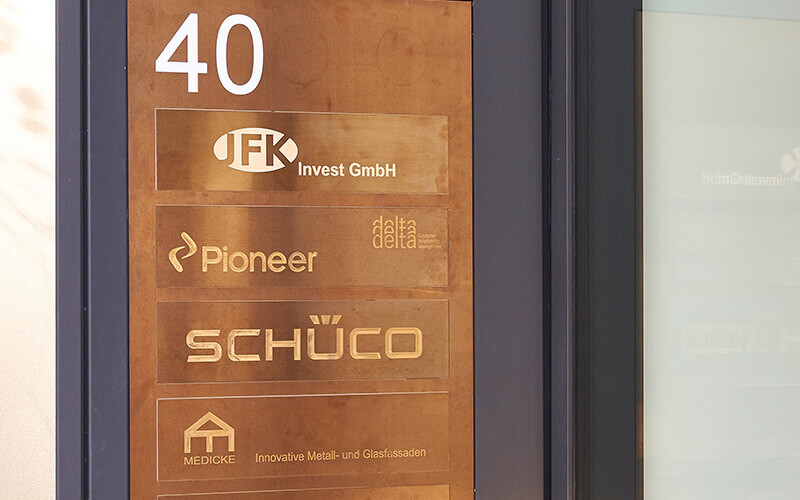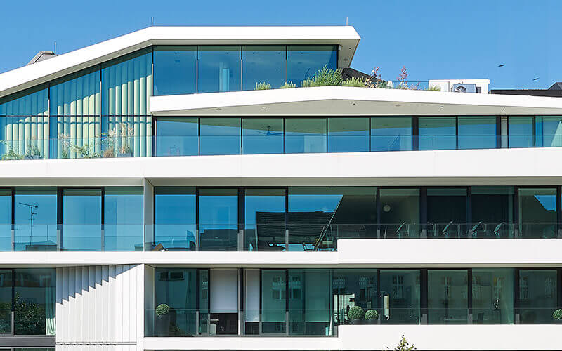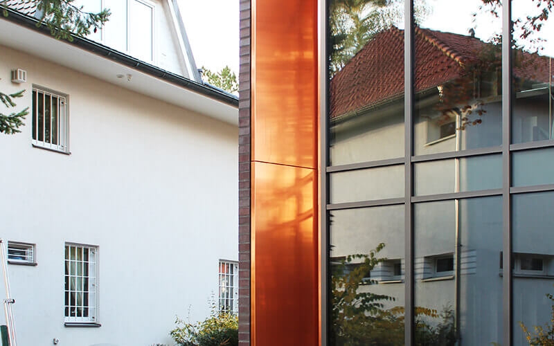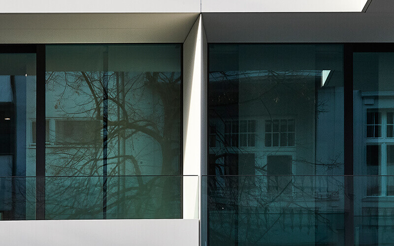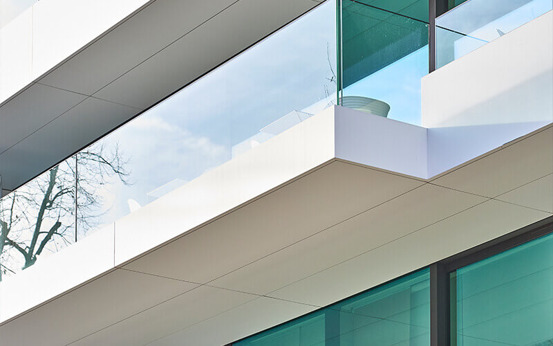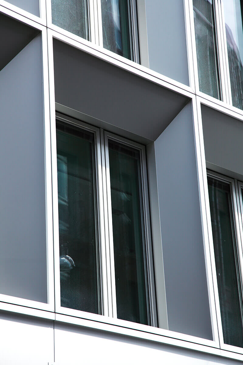 Gesimsbänder kombiniert mit schwarz beschichteten Aluminiumkassetten