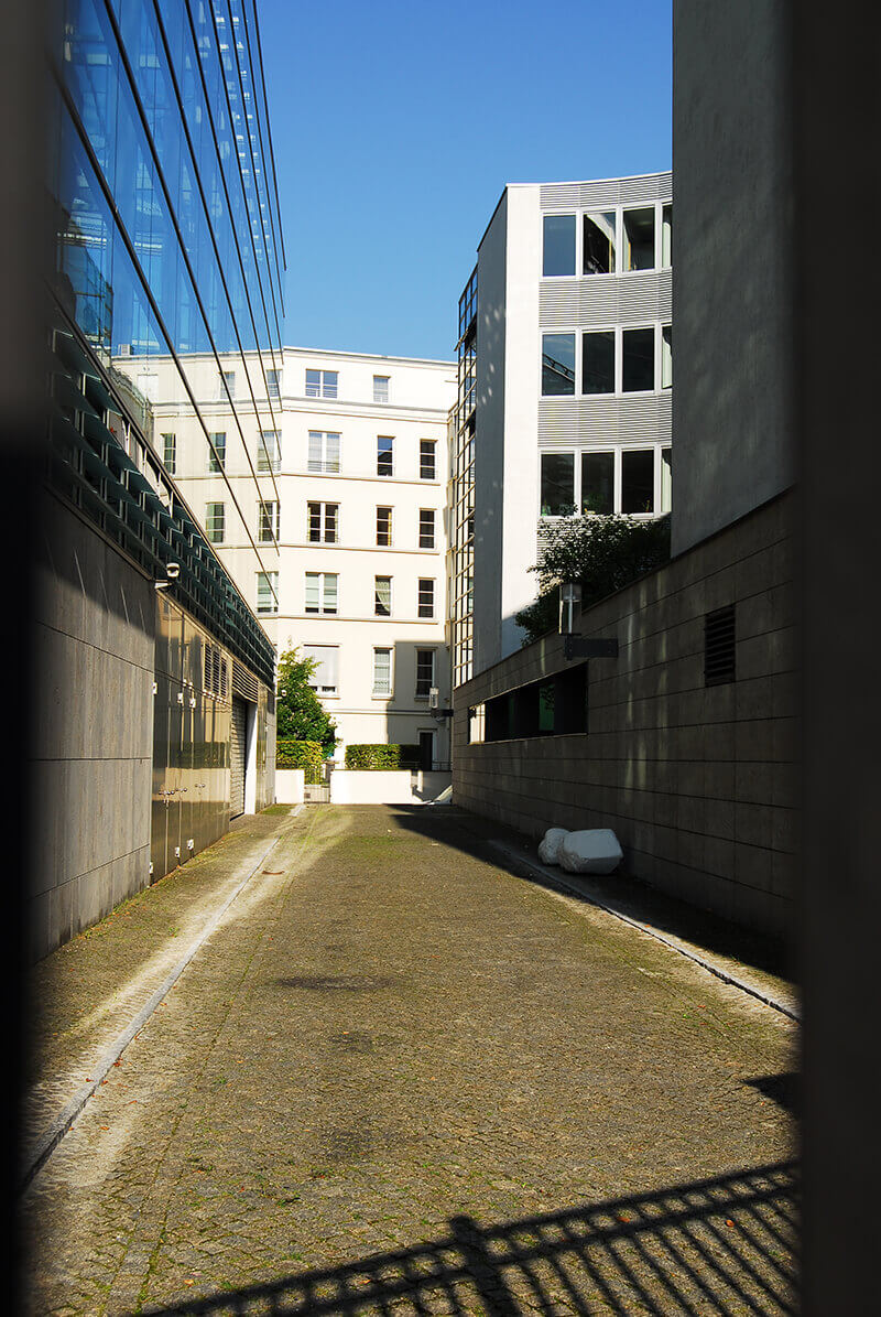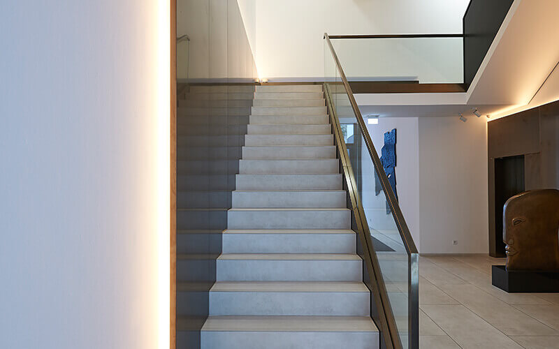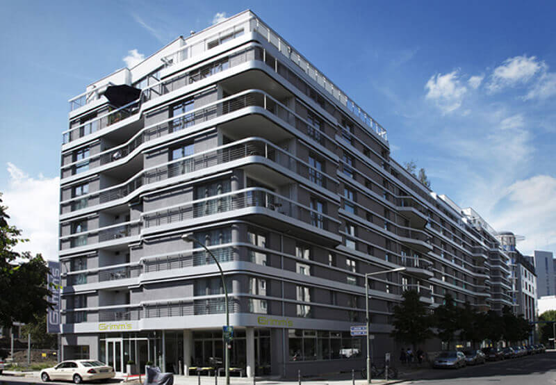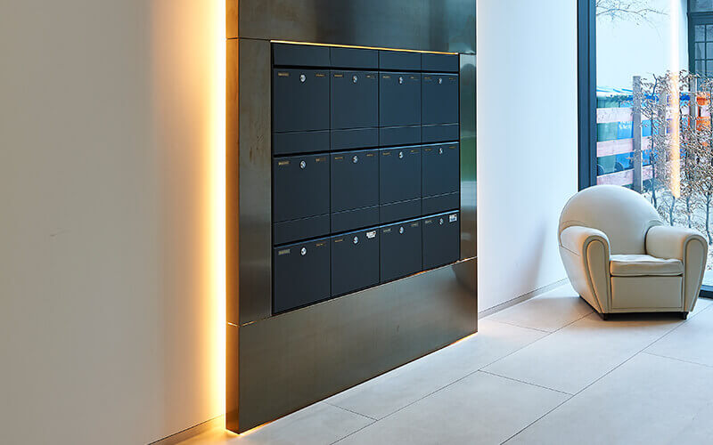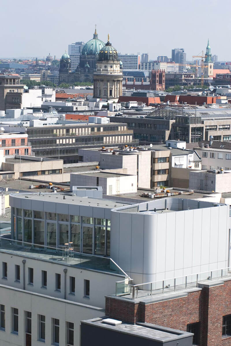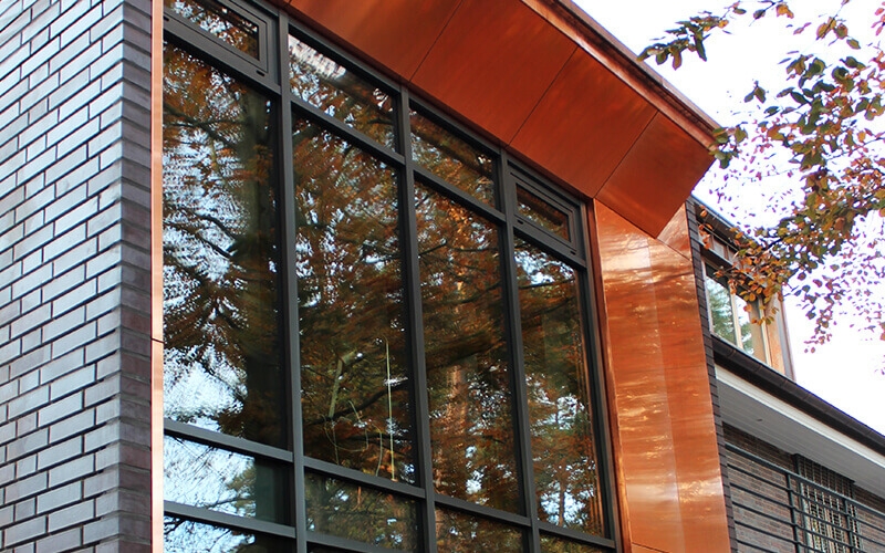 Gesimsbänder kombiniert mit schwarz beschichteten Aluminiumkassetten
