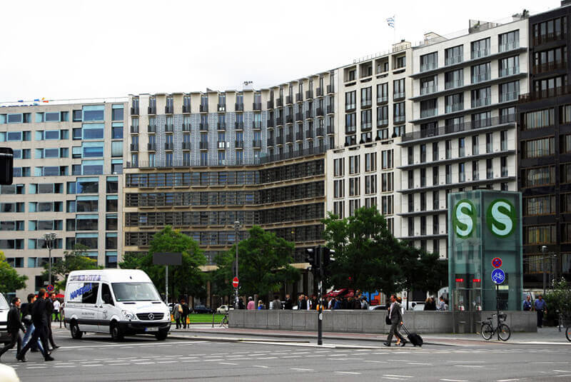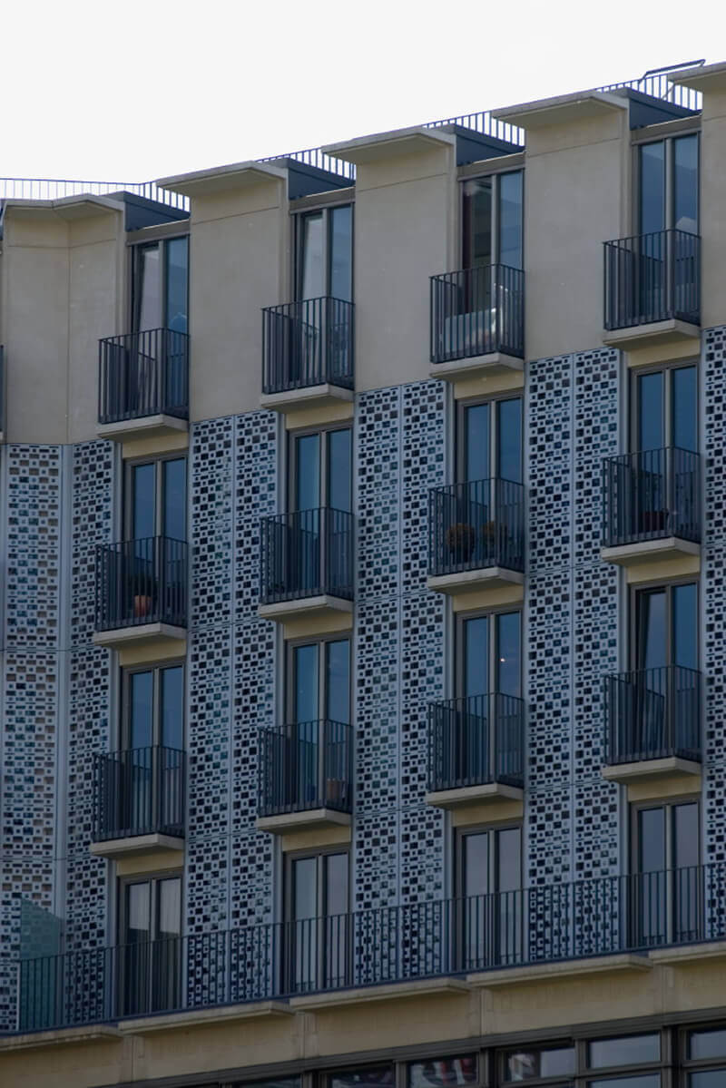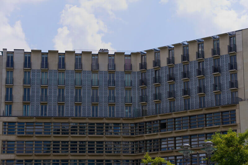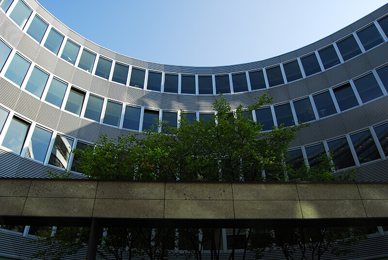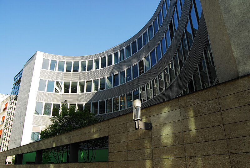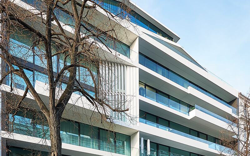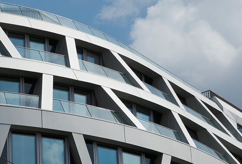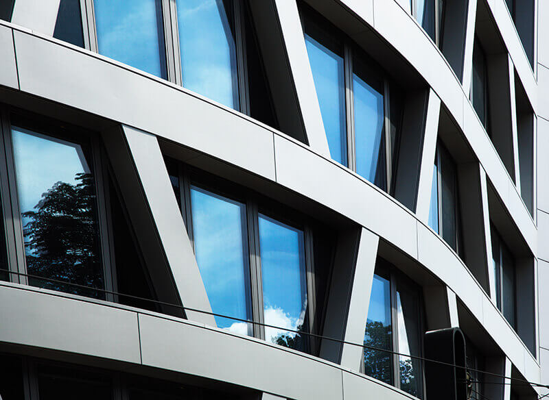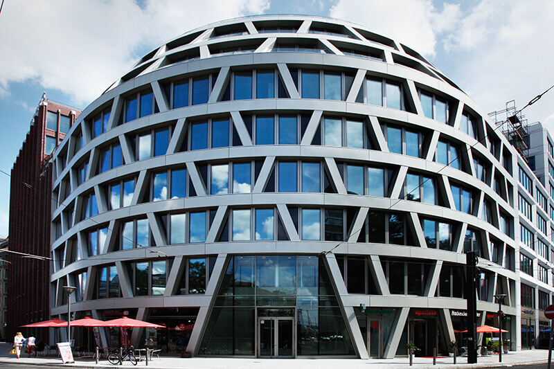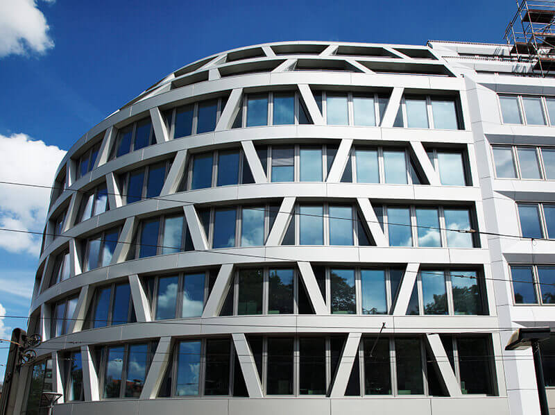Bogenförmige Fassade mit dreidimensional verformten Kassetten