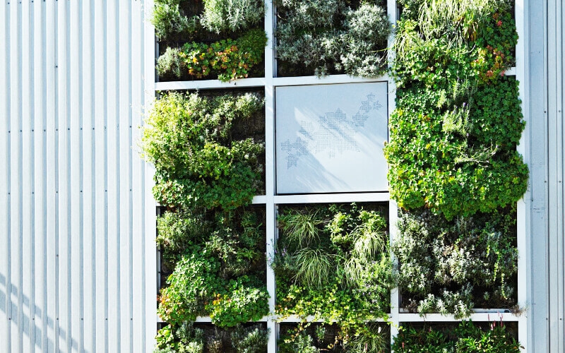Durch ein begrüntes Rinnensystem wurde ein Weg für die Entwässerung gefunden und zugleich ein Areal für Nutz- und Zierpflanzen geschaffen. Darüber hinaus hart sich auch ein Vorteil gegenüber des Gebäudeklimas ergeben. Das Gründach wird von einer patentierten begrünten Aussenfassade ergänzt, denn Pflanzenfassaden wirken sich noch günstiger auf das Raum- und Stadtklima aus als begrünte Dächer.